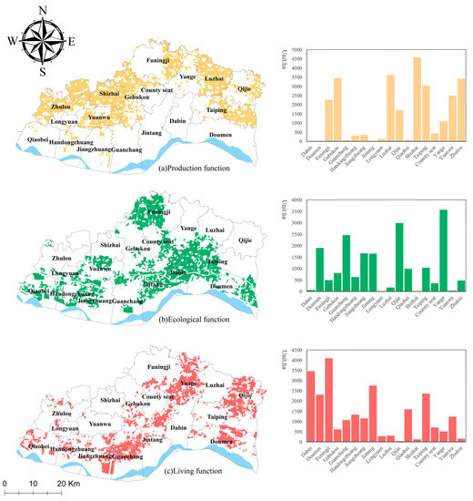 NRCA was used to measure the leading CLUFs of each plot. The results (Figure 5) show that the total area of the plots with the leading CLUF of production is 270.51 km2, accounting for 38.39% of the total cultivated land area. These areas are mainly concentrated in some parts of Shizhai Township (45.76 km2, 16.91%) and Luzhai Township (36.12 km2, 13.35%). The cultivated land in these regions mainly has a production function, providing food production, vegetables, and fruit cultivation to ensure food security and improve farmers’ economic benefits. The total area of the plots with the leading CLUF of ecological function is 240.91 km2, accounting for 34.16% of the total cultivated land area. These areas are mainly concentrated in the western part of Funingji Town (40.91 km2, 16.99%) and Dabin Town (34.61 km2, 14.38%). The cultivated land in these areas mainly has an ecological function, with prominent functions of water conservation, pollution control, and environmental purification, ensuring the normal operation of the natural environment and ecosystem. The total area of the plots with the leading CLUF of living function is 193.46 km2, accounting for 27.45% of the total cultivated land area. These areas are mainly concentrated in several areas, including Yanga Township (36.57 km2, 18.43%) and the western part of Qijie Town (29.92 km2, 15.46%). The cultivated land in these areas mainly has the functions of recreation and social security, as well as maintaining social harmony and stability.