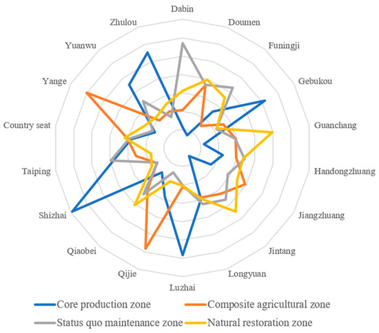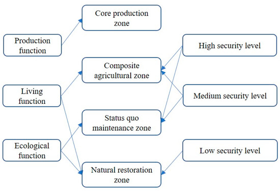 The main function and role of cultivated land is to guarantee food production. Thus, regardless of the ecological security level, the cultivated land with an agricultural production function is classified as the core production zone, the core task of which is to guarantee food production and maintain food security. However, in areas with a high level of ecological security, we classified the cultivated land, for which the social life function is the leading CLUF, as the composite agricultural zone, the task of which is to carry out food production for this area as well as composite agricultural production based on its own advantages in order to increase farmers’ income while ensuring production. In addition, areas where the leading CLUF is the landscape ecological function were classified as the status quo maintenance zone, i.e., the existing production conditions are fully maintained; thus, the ecological quality and cultivated land yield do not decline. Finally, the cultivated land with a low ecological security level and a non-food production function was classified as the natural restoration zone, i.e., focusing on ecological restoration on the basis of agricultural production to stabilize ecological safety (Figure 6).