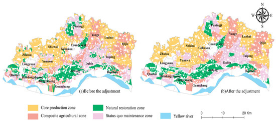 The adjusted cultivated land use zoning achieved the effect of spatial clustering, which is not only convenient for implementation and management but can also achieve scale benefits to a certain extent.