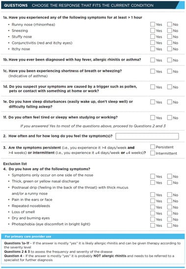- Bousquet, J.; Schunemann, H.J.; Fonseca, J.; Samolinski, B.; Bachert, C.; Canonica, G.W.; Casale, T.; Cruz, A.A.; Demoly, P.; Hellings, P.; et al. MACVIA-ARIA Sentinel NetworK for Allergic Rhinitis (MASK-Rhinitis): The New Generation Guideline Implementation. Allergy 2015, 70, 1372–1392. [Google Scholar] [CrossRef] [PubMed]