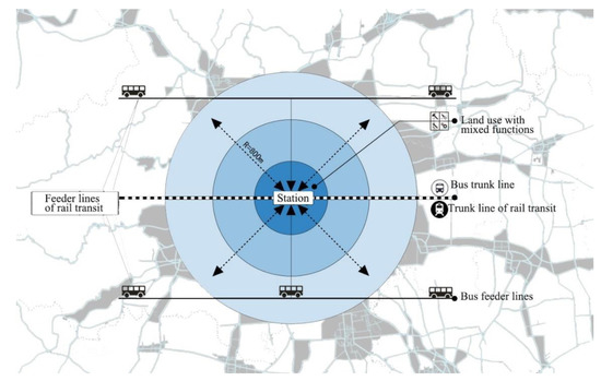 Urban development has spread in a disorderly manner to surrounding areas in recent years. In order to promote the functional integration of cities, realizing closer connections with public transport networks, adjusting the urban structure, and compressing the urban scale have become top priorities [9]. In addition, the potential value of rail transit stations and the development of integrated urban stations is understood. With the development of land use around railways and subways, the problem of disordered urban development has become serious, not only in the central areas around stations, but also in sparsely populated areas. The changes in land use around rail transit stations represents the development of commerce, industry, agriculture, housing, parks and green spaces, urban facilities, etc. [10]. Due to the continuous development of land, these influencing elements will gradually lead to one or more radiation circles forming in the process of change, which will have diverse impacts on the development of cities and people’s lives. In this study, such areas are called “station zones”. In order to promote development inside and outside the station zones and adjust the disordered urban development, it is urgent to constantly explore new ways of developing rail transit.