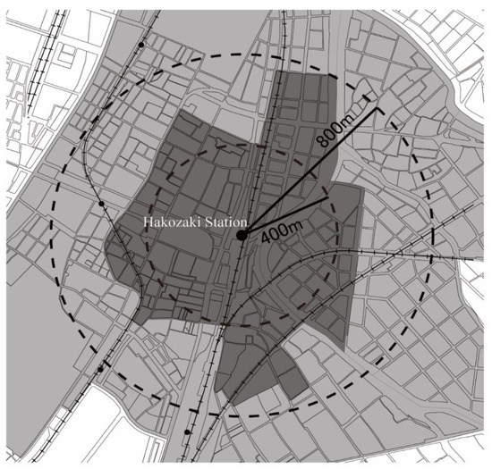 In January 2009, there were 74 stations in Fukuoka City (except the Shinkansen bullet train). The goal of this study was to analyze the transition of station zones; thus, circles with 0–400 and 0–800 m radius from the center point of each station were set, in relation to the spatial location of chomes. Figure 3 shows the setting of Hakozaki Station, a main subway station in Fukuoka, as an example. The dark grey represents the overlapping chomes of 0–400 m radius from center of object station, and the dark + light grey represents the overlapping chomes of 400–800 m radius from center of object station.