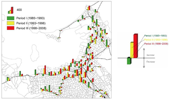 Figure 4 shows the average annual population changes in station zones and the average annual growth rate within the influence range of stations in three periods: period I, 1985–1993; period II, 1993–1998; and period III, 1998–2008. In the figure, annual population growth in the three periods is indicated in green, yellow, and red, respectively. The vertical bar above the horizontal line represents the increment. It can be seen that population growth in the urban center basically occurred in the third period, and in the suburbs mostly occurred in the first period. Based on this, we can conclude that the population in Japanese rail transit station zones returned from the suburbs to the city center in recent years.