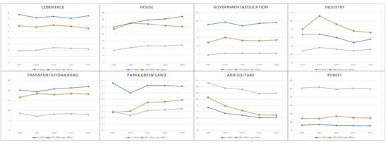 From the comparison of the development span of land use around station zones over the 30 years under study, it can also be found that park and green spaces in the central area of Fukuoka gradually increased. The proportion of forest continually increased in the 0–800 m and 800+ m radius from 1985 to 2008, and the proportion of residential buildings increased in both. Comparing the data of 0–400 m, 400–800 m, and 800+ m radius, the proportion of commercial land declined somewhat, the ratio of industry was reduced, the proportion of agriculture land in the suburbs also tended to decrease, and government and education land also declined from the 0–400 m radius to the 800+ m radius, which can be seen from the ratio of land use of station zones (Figure 5).