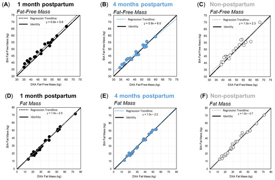 Deming regression plots for fat-free mass (A–C) and fat mass (D–F) for women at one month postpartum (black), four months postpartum (blue), and the non-postpartum control group (grey). Solid diagonal lines represent the line of identity, and dashed lines show the respective regression trendlines.