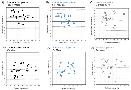Bland–Altman Plots for Fat-Free Mass (A–C) and Fat Mass (D–F) for women at one month postpartum (black), four months postpartum (blue), and the non-postpartum control group (grey). Dashed lines show the respective mean differences and limits of agreement.