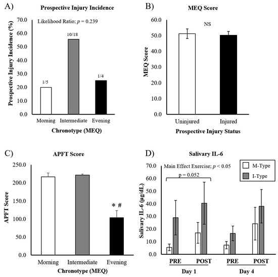 APFT performance, injury incidence, and IL-6 response to ROTC-PT based on chronotype. (A) Prospective injury incidence was recorded during the semester of ROTC PT, and was not different between chronotype groups. (B) Mean MEQ scores were not different between injured and uninjured cadets. (C) APFT test was performed at the end of training. (D) Salivary IL-6 increased in response to exercise, but was not different based on chronotype. Note: salivary IL-6 data for evening chronotypes are not presented, as all cadets in this group were above the detection limit of the assay, suggesting very high IL-6 levels in this group. Data are presented as mean ± SEM. * different from ‘M-Type’, # different from ‘I-Type’, p < 0.05.