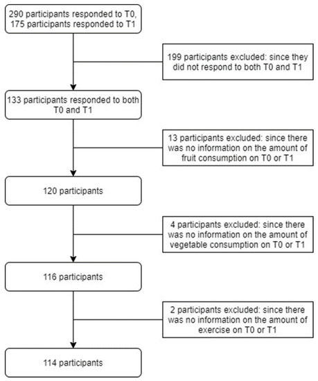 The study population included workers from a Dutch construction company aged between 18 and 67 years. The company was recruited from the network of the researchers and selected because of its relatively high proportion of blue-collar workers and its willingness to participate [39]. The company delivers services related to construction, restoration, renovation and maintenance of buildings. The company had 309 employees, of which 133 were blue-collar workers and 176 were white-collar workers. Participation to the co-creation of the WHPP was voluntary and no additional motivation strategies were used [39]. When the developed WHPP was implemented, the company made participation obligatory for its employees, but respondence to the questionnaires was voluntary. In total, 133 workers that participated in the Citizen Science-based WHPP responded to the questionnaires on both T0 and T1. Respondents were excluded from this study when data were missing on the outcome measures as defined by vegetable or fruit consumption (n = 17) or physical exercise (n = 2), either on T0 or T1. Finally, 114 participants were included in the analyses of this study (Figure 1).