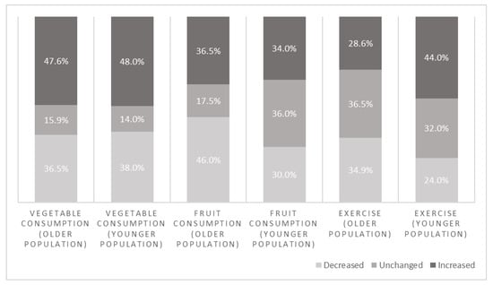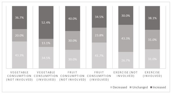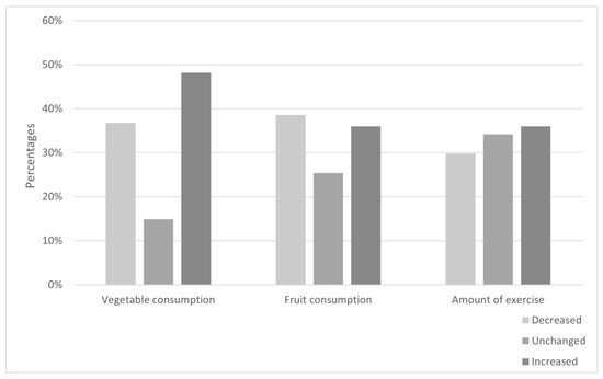 Figure 2 shows the proportions of changed lifestyle behaviors: decreased, unchanged or increased for amount of fruit or vegetable consumption and frequency of physical exercise. Regarding vegetables, 37% had a decreased consumption, 15% had an unchanged consumption and 48% had an increased consumption. Regarding fruit, 39% had a decreased consumption, 25% had an unchanged consumption and 36% had an increased consumption. Regarding physical exercise, 30% had a decreased frequency of exercise, 34% had an unchanged frequency of exercise and 36% had an increased frequency of exercise.