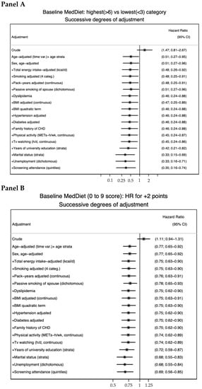 | Mediterranean diet adherence screener (MEDAS, 0 to 14) | <5 | 5 to 6 | 7 | 8 to 14 | Per SD |