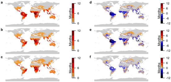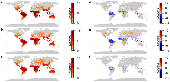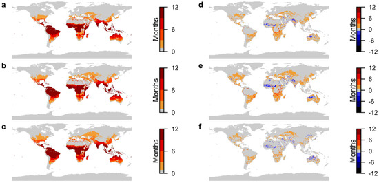 Malaria is currently endemic in Africa, south of the Sahara, and in parts of Central and South America and South Asia [28]. This is reflected in the present-day results (Figure 1a), which show that most of the areas suitable for malaria transmission are located in the tropics, and large parts of the regions where malaria is known to be endemic are suitable for transmission for 10 months of the year or more.