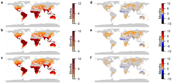Shorter periods of transmission suitability are projected to spread into previously unaffected areas in Europe, North America and Russia. In the northern temperate zone under both climate change scenarios these new areas are suitable for between 1 and 2 months (Figure 4d,e), whilst SSP5-8.5 indicates larger and more northerly areas being affected (Figure 4f). Although the differences in transmission suitability between the best- and worst-case climate change scenarios are small for all diseases combined, between 2 and 3 months, Figure 4f shows that considerably more areas across the globe could see the introduction of these diseases under SSP5-8.5.