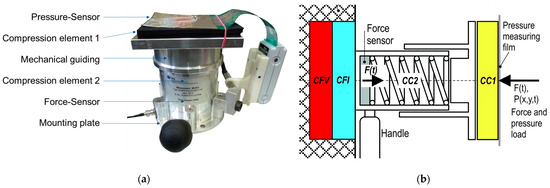 The present section gives an overview of the biofidel force-measuring device architecture. Specifically, it presents important components and explains their functions. The functionality of a prototype device (Figure 1a) can be changed by manipulation of each component for specific evaluation of the impact on measuring results. The new findings are used for a final comparison to collision test devices that already exist on the market, whose architecture is comparable to the prototype device. Figure 1 shows the main functional components of the force-measuring device. The location of the compression elements (i.a., CC1 and CC2) and the force and pressure sensors are shown in the schematic diagram (Figure 1b).