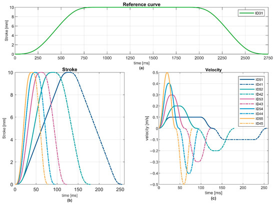 The bottom row of Figure 3 shows exemplary curves representing a stroke of 10 mm, which differ regarding the maximum velocity. The solid part of each curve represents a movement in one direction until the parameterised stroke is reached, while the dashed part also describes the reverse motion to the pre-set home position. The curves are triggered by an ID Number, which represents the general progression characteristics.