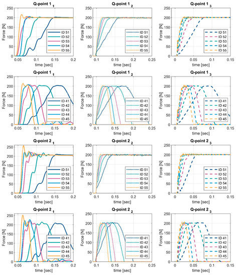 Measured force-time behaviour for devices 1 (left), 2 (middle), and 3 (right), when adding both Q-Point conditions under both loading movements ID 41–45 and ID51–55. Each device is marked with subscript indexes 1, 2 and 3.