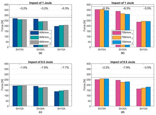 Measured mean force under two load levels [0.5 J (c,d) and 1 J (a,b)]. Comparison of CC1 elements combined with 40 N/mm (a,c) and 75 N/mm (b,d). Each device is marked with subscript indexes 1, 2 and 3. CC1 elements with a shore hardness of 70, 30 and 10 are used.