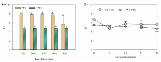 In treatments with 50% inoculum, the pH of WSI-50% was significantly higher than that of EWSI-50% (p < 0.05), but the pH of both groups reached a similar value with an extending fermentation time, indicating that I. lacteus can secrete organic acids and reduce the pH of substrates [28]. To summarize, ensiling can enhance the colonization ability of I. lacteus in WS and thus reduce the requirement of the inoculation amount, which is an effective strategy for providing a competitive advantage for WRF growth.