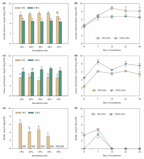 Figure 1 depicts the pH and culturable microorganisms in different treatments. The inoculation amount had no significant effect on the pH of EWSI after 28 days of incubation (p > 0.05), which ranged around 4.7 (Figure 1a). For the control treatment, the decreased pH was only observed in substrates with 50% inoculation (p < 0.05). Unlike other aerobic microorganisms, WRF can produce organic acids and some other active chemicals to inhibit most coexisting microorganisms, so the pH of substrates is an important index to evaluate WRF growth [23,27]. In this study, pH variations reflect that ensiling promotes the proliferation of I. lacteus in WS, consistent with previous reports [23,24].