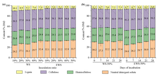 Ensiling is a technology that uses the anaerobic fermentation of lactic acid bacteria (LAB) to preserve high-water-content feed crops [15,16]. This technology not only effectively avoids loss caused by poor weather conditions during drying but also reduces the risk of fire during storage [17]. Studies have demonstrated that ensiling can increase the hydrophilicity of lignin and the number of small holes in the cell wall, thus improving the enzymatic digestibility of Napier grass and Arundo donax [18,19]. Although the anaerobic process has little effect on lignin content and cannot remove lignin’s blocking effect on cellulase [20], the pH and the growth of harmful microorganisms in ensiled substrates decreases significantly after several weeks of anaerobic fermentation, allowing most silages to retain an adequate quality after several days or even weeks of opening [21,22]. Our previous studies have confirmed that I. lacteus has strong resistance to foreign bacteria and acidic conditions, so it colonizes well in ensiled WS (EWS), corn stalk, and oat straw [23,24,25]. However, the effects of ensiling on inoculation ratio, chemical composition, and enzymic efficiency are still unclear.