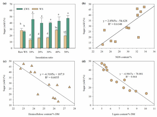 Figure 4 depicts the sugar yields of various raw materials and treatments. The sugar yield of WS after 72 h of enzymatic hydrolysis was 28% and ensiling had no significant effect on the value (p > 0.05). After fermentation with I. lacteus for 28 days, the sugar yield of samples in WSI below 40% inoculation significantly decreased (p < 0.05) and that of WSI-50% had no significant difference with raw materials (p > 0.05). In contrast, the sugar yield of samples in EWSI increased by 40% to 47% (p < 0.05), which is equivalent to the sugar yield of WS delignified with 1.5% NaOH or 80% p-toluenesulfonic acid [33]. Further analysis reveals that sugar yield was positively correlated with NDS content (p < 0.01) and negatively correlated with hemicellulose and lignin contents (p < 0.01) but no significant correlation was observed between cellulose content and sugar yield. Considering the negative correlation between lignin and hemicellulose contents and the positive correlation between lignin and NDS contents, we inferred that the increased sugar yield of WS after fermentation with I. lacteus was mainly caused by the degradation of hemicellulose and lignin [2,10]. Above all, I. lacteus can effectively colonize in EWS and destroy the complex network of cellulose and hemicellulose, promoting the enzymatic hydrolysis of cellulose, so combining ensiling with I. lacteus fermentation is an effective method for high-value uses of WS.