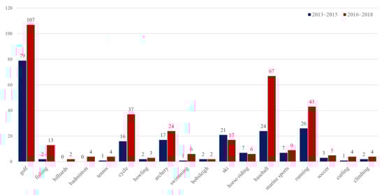 According to the Korean IPO (Figure 1), there have been 357 patent applications in the field of virtual reality sports over the past three years (2016–2018). This is a 69% increase from the 211 applications (2013–2015) over the previous three years, and the growth of screen golf and screen baseball-related technologies is particularly noteworthy []. The fact that the number of patent applications for screen golf and screen baseball is much higher than that of other sports reflects the popularity of these two events.