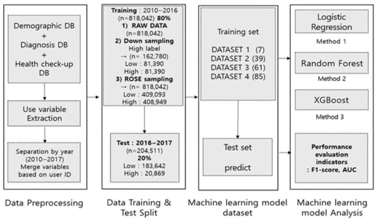 High-cost medical expense classification prediction supervised learning was performed using the logistic regression [26,27] model, random forest [28], and XGBoost [29,30,31] method, which has been known to result the best performance and explanatory power among the machine learning algorithms used in previous studies that performed high-cost prediction research. In this study, data pre-processing and machine learning were conducted by remotely accessing the virtual room of the National Health Insurance Corporation. R studio version 3.3.3 was used as the analysis program used in the study. Figure 2 shows our experiment framework.