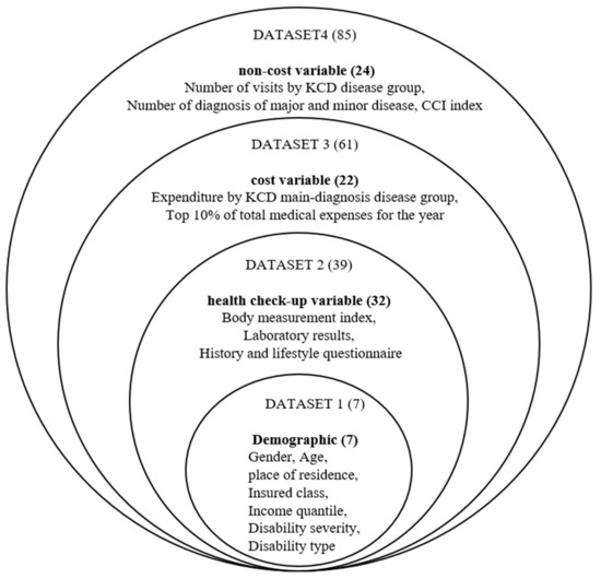 Lee et al. [6] made cost predictions through comparison of classification regression tree performance with ANN with 492 patient data. They demonstrated the superiority of ANN’s performance in cost prediction using Demographic, Diagnosis, Number of treatment tests, Length of stay, Number of surgeries as predictors. Powers et al. [7] evaluated regression statistical modeling methods for predicting expected total annual health costs using the Pharmacy Claim-Based Risk Index (PHD). As a result of the study, it was confirmed that the pharmacy claim data PHD can be used to predict future medical costs. Koing et al. [8] analyzed the effect of complex injuries in which three or more chronic disease states occur simultaneously on medical costs. Conditional inference tree algorithms were used for 1050 people. Studies have shown that Parkinson’s disease and heart failure are the most influential predictors of total cost. Bertsimas et al. [9] analyzed cost prediction for the first time using supervised learning as a previous study that predicted future costs as a cost variable. For two years from August 2004 to July 2006, total insurance expenditure medical expenditure was predicted using regression decision trees and clustering methods using medical, demographic, and cost-related input variables. The results confirmed that using 22 cost-related variables and using the CART regression decision tree algorithm as a classifier showed the same performance as the analysis performance by adding medical and demographic variables (approximately 1500 variables). Sushmita et al. [10] evaluated the use of regression trees, M5 model trees, and random forests for cost prediction, and confirmed that M5 performed best. The prediction results confirmed that the previous medical cost alone could be a good indicator of future medical costs. To predict patients’ costs for the next year, they studied using a set of Medical Expenditure Panel Survey (MEPS) data taken from responses to panel surveys provided to households, employers, health care providers and insurance providers over a two-year period. Duncan et al. [11] compared several machine learning and statistical models to predict patient costs, including M5, Lasso, and boosted trees. We experimented with 30,000 patients using data from 2008 for training and using the total allowance of claims for 2009 for testing. Various predictors were used as input variables, including the total cost of the previous year, total medical expenses, total pharmacy costs, demographic information, total visits, and chronic diseases (83 different states). The results showed that boosted stress and M5 were the most effective classification methods in the R2 and Mean Absolute Error (MAE) evaluation indicators, respectively, and that the cost predictor was a strong predictor. Itsuki et al. [13] used MinaCare data to perform a 2016 high-cost medical cost prediction based on data for two years from 2013 to 2015. The study was conducted based on a previous study (Park et al. [12]) that the high-cost prediction performance was improved when health examination data were used together in the previous study. The study found that the model for predicting medical costs using clinical data and billing cost data showed improved performance for high-cost patient prediction compared to the prediction model that uses only existing billing data.