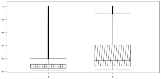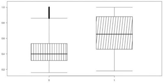 Unbalanced data performed high accuracy by classifying classes from minority categories into majority categories for high accuracy, confirming that accurate machine learning training was not performed. The box-plot in Figure 4 is a diagram that visualizes the classification performance of the test set with an algorithm that trained the prediction model with the raw dataset 4. The average of the classes classified into the low-cost group (0) and the high-cost group (1) is shown, and there is no difference in the average between the two groups. The standard prediction value for distinguishing the high-cost group from the low-cost group is 0.5. In Figure 4, the predicted average value of the high-cost group is 0.2, and it can be seen that most of the actual high-cost groups are classified into the low-cost group.