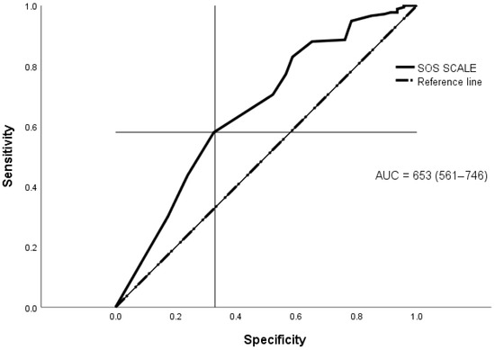 These appropriate correlations corroborate the use of the SPRINT-E as the accuracy standard for the SOS. For a number of 176 (79.28%) observed cases of PTSD, SOS shows 58% of sensitivity and 67% of specificity in its detection. Therefore, its accuracy is regular (AUC = 0.653; p < 0.01; CI = 0.568–0.739), with a Youden index [J] = 0.2535 (CI 95% = 0.09 to 0.36) and an optimal cut-off score of 27 points (CI = 24–29) (Figure 3).