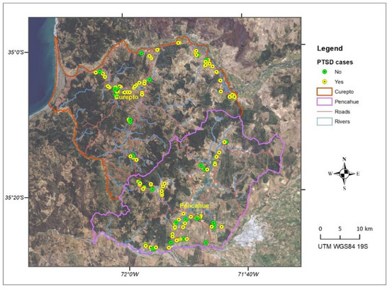 Figure 4 and Figure 5 show the spatial distribution of cases detected for solastalgia and PTSD. It is possible to appreciate a greater concentration of positive cases in communal areas more exposed to drought phenomena, such as the banks of the Mataquito River in the Northeast of Curepto and in agricultural valleys, where a decrease in flows and groundwaters have impacted agricultural and livestock activities. In turn, a concentration of positive cases in mountain areas can be seen, where multiple forest fires have affected forestry activity, such as the south of Curepto and the west of Pencahue.