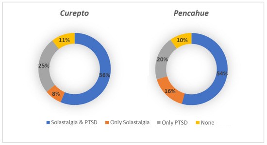 When observing both maps, a similar pattern in the spatial distribution of solastalgia and PTSD cases can be noted, which is expected, given the high level of correlation between both scales. Figure 6 shows the integration of the solastalgia and PTSD cases, where the spatial pattern of cases detected is more concentrated in Curepto than in Pencahue, and which would be related to the lack of water availability, in an area that greatly depends on this resource. It is worth mentioning that, on the one hand, Curepto is located between the coastal plain and the coastal mountain range, and it is an area that has suffered more significantly from the drought phenomenon. On the other hand, the municipality of Pencahue is located further inland, and benefits from the greater implementation of irrigation systems and channels, so its inhabitants have better endured the situation. Figure 7 shows that, in terms of proportion, the most important difference between the locations lies in the cases presenting only solastalgia or PTSD. It is evident that Curepto has a higher percentage of only PTSD cases than Pencahue because its inhabitants have faced more extreme conditions in terms of drought and forest fires, both situations that are more closely related to PTSD.