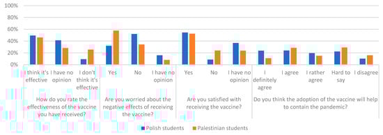 The aim of this study was to check the opinions of Polish and Palestinian students as to the effectiveness of vaccinations against COVID-19. Both populations live in different geographic zones and social, health and political conditions. For this reason, it is meaningful to learn about the opinions of young people in terms of the research problem undertaken. This study shows the vital role of the access time to a vaccine and the resulting opinion of young people who are often critical of vaccination. It should be emphasized that Palestinian students started receiving vaccinations later than other communities, which was caused by the lack of availability of vaccines due to cross-border conditions and, consequently, by limited epidemiological activities [18]. The undertaken problem of research among students is part of the general discussion on the adopted vaccinations, where universities play a huge role in organizing vaccinations at university campuses, as well as in generating pro-vaccination attitudes [19].