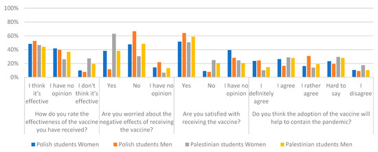 Analyzing the obtained data on the effects of vaccination, respondents from the University of Bethlehem to a large extent are afraid of the negative effects of vaccination (57.8%), and there is less concern among Polish students (31.9%). At the same time, women from Palestine (63%) and Poland (34.2%) are more concerned, despite the fact that more than half of women from both countries positively evaluate the vaccine adopted. The reluctance of the Palestinian population for vaccines, as other studies show in this respect, results from false information provided in social media and lack of confidence in the vaccines purchased by the government [28].