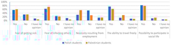 Polish and Palestinian students also answered the question, which motivated them to adopt a vaccine. Most people, approximately 80% of two groups of respondents, admitted that possibilities to participate in social life (meetings, parties, going to a restaurant/pub, cinema, theater) were meaningful. The second most common factor that motivated Polish respondents (75%) to take the vaccination was the ability to travel freely, while Palestinian students (72.9%) was fear of infecting others. For three answers, the chi-square test showed dependence on nationalities. They were fere of infecting others, necessity resulting from employment and the abilities to travel freely. The least often respondents from Poland and Palestine as a motivating factor for vaccination indicated the necessity of resulting from employment. Palestinian students more often (55.7% of people) than Polish students (30.7% of people) pointed to the necessity resulting from employment as an incentive for vaccination. The chi-square test did not show differences in the fear of getting sick factor as motivating to vaccinations. A total of 56.6% of students from Poland and 60.6% from Palestine pointed out that this factor motivates them to vaccinate. Response results to the motivation to adopt the vaccine are presented in Figure 3.