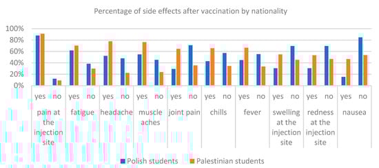 Analyzing responses to the question about the occurrence of side effects after the vaccine adoption, the chi-square test showed that in addition to pain in the injection site, in all other cases of side effects, their appearance is dependent on the respondents’ nationality (p < 0.001). Pain at the place of administration of the vaccine occurred in 88% of the respondents from Poland and 91% from Palestine. Statistically, these results are not dependent on the nationality of respondents (p = 0.191). In all other answers to the question of the occurrence of side effect, the respondents from Palestine significantly confirmed the instance (p < 0.001). The largest differences between Polish and Palestinian students were observed in question about the occurrence of joint pain. As many as 5% of Palestine respondents confirmed this effect compared to 29% of respondents from Poland. Itching at the place of injection confirmed 55% of Palestinian and 30% of Polish respondents. Detailed quantitative results and the chi-square tests of respondents from Poland and Palestine on the occurrence of side effects are presented in Table 4 and graphically on Figure 4.