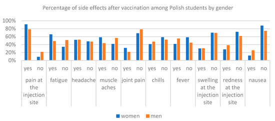 Comparison of the number of side effects after receiving the vaccine among Polish students by gender.