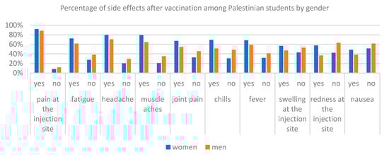 With the help of the chi-square test, statistically significant differences between the answers were examined regarding the occurrence of side effects among Polish and Palestinian respondents due to gender (Table 4, Figure 5 and Figure 6). Among Polish respondents answers to questions about pain in the injection site, fatigue, muscle pain, fever and nausea after vaccination are dependent on gender. In this case, as many as 91% of the respondents of women and 78% of men from Poland felt pain in the place of injection, 66% of women and 49% of men experienced fatigue, 58% of women and 44% of men experienced muscle pain, 42% of women and 55% of men had fever and 12% of women and 26% of men from Poland felt nausea after vaccination. Differences in Palestinian responses to the question about the side effects of the chi-square test showed for answering questions about headaches, muscle pain, joint pain, chills and redness in the place of the evolution. In all these five cases, more women have stated such a side effect of vaccination than men. For example, headaches was indicated by 80% of women from Palestine and 71% of men, muscle pain was indicated by 79% of women and 65% of men, joint pain was indicated by 67% of women and 54% of men, chills were indicated by 69% of women and 51% of men, and redness was indicated 58% of women and 37% of men from Palestine. Percentages of answers of respondents from Poland and Palestine for questions about the side effects are presented according to Figure 4 and Figure 6.