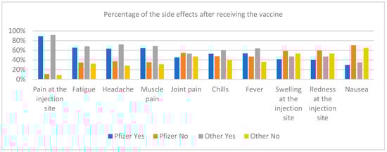 Percentage of the occurrence of side effects after vaccination with Pfizer and other vaccines (i.e., Moderna, AstraZeneca, Johnson & Johnson, and Sputnik).