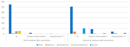 Comparison of the number of Polish and Palestinian students needing a doctor’s help or hospitalized after vaccination. N number of vaccination; * each person is counted only once if there was a need for a doctor’s help, regardless of the number of contacts and vaccination doses, excluding hospitalizations; ** each person is counted only once if there is a need for hospitalization, regardless of the number of hospitalizations and vaccination doses.