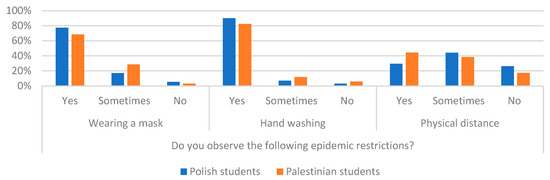 Students from Poland and Palestine were asked if they observe epidemic restrictions (wearing a mask, hand washing, and distancing behavior). The chi-square test showed statistically significant differences in three cases by comparing the answers of Polish and Palestinian students (p < 0.05). More Polish students wear a mask (77.4%) and wash hands (90.1%) compared to students from Palestine, where this percentage is 68% and 82.5%, respectively. However, in terms of physical distancing, 44.3% of the Palestinian respondents maintained it. For comparison, this was only true of 29.5% of Polish students. Figure 9 presents the results of students from Palestine and Poland on compliance with epidemic restrictions.