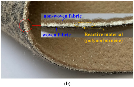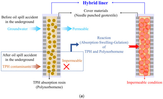 The hybrid liner uses the concept of the geosynthetic clay liner (GCL), which can absorb and swell the contaminants to achieve an impermeability efficiency. The concept is shown in Figure 1a. The hybrid liner consists of a reactive material and geosynthetics (Figure 1b). The reactive material (polynorbornene) that reacts to TPH, is restrained with needle-punched geotextiles on the upper and lower surfaces. The reaction principle of the hybrid liner is that before TPH leaks in the soil, groundwater has a normal flow because the groundwater does not react with polynorbornene. However, once TPH leaks and diffuses, it comes into contact with polynorbornene, causing absorption, expansion, and gelation of polynorbornene, as shown in Figure 2 [32]. Due to the reaction over time, an impermeable layer is formed because of the impermeability property of the hybrid liner, preventing further diffusion of TPH. The concept and principle of the hybrid liner are explained in detail in a previous study [32].