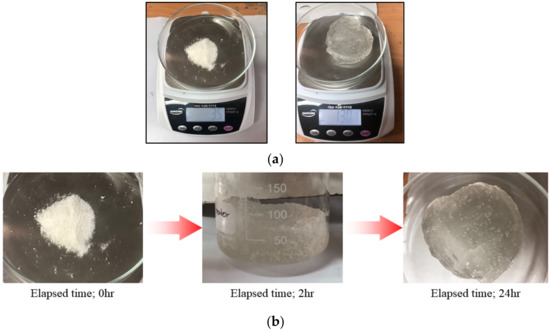 Absorption, expansion, and gelation of polynorbornene (reactive material): (a) Weight change after the reaction with TPH, before: 3.5 g, after: 130.1 g; (b) Gelation over time [32].