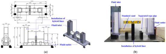 Figure 3 presents a schematic of the permeability test apparatus. The apparatus consists of an inlet and outlet tank of water and a separated circular pipe between the bottom of the inlet and outlet tanks, which can be used to simulate soil. The hybrid liner was installed and assembled in the center of the separated circular pipe, and all joints were processed and secured to avoid leakage of water and soils and to ensure the reliability of the permeability test results. The diameter of the hybrid liner installed in the permeability test apparatus for the lab. scale experiment is 0.1 m.