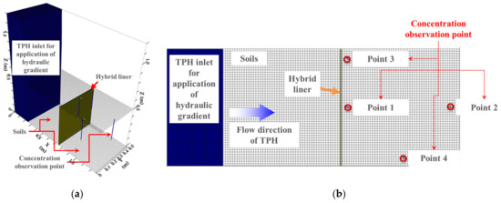 Figure 4 shows a 3D view and plan view of the FDA model. The TPH inlet box, for applying the hydraulic gradient, the soil with a permeability of 1.0 × 10−4 cm/s to simulate the soil conditions of the permeability test, the hybrid liner, and four observation points for measuring the TPH concentration of the soil passed through the hybrid liner, were modeled. Based on the total length of the soil (L = 0.5 m) behind the hybrid liner, two points were placed at 0.03 m (point 1, point 3), one point at 0.27 m (point 4), and one point at 0.47 m (point 2) from the hybrid liner. Table 2 lists the conditions for the FDA.