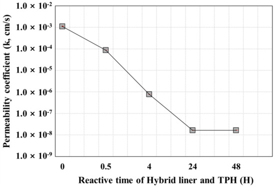 At a hybrid liner-TPH reaction time of 0.5 h, the permeability coefficient decreased, but not to a level that could block fluid. By contrast, the permeability coefficients of the hybrid liner at hybrid liner-TPH reaction times of 4 h or more, rapidly decreased. The coefficient at 4 h, was 1.0 × 10−7 cm/s, which indicates an impermeable layer. Thus, the hybrid liner secured the performance of an impermeable material at a 4 h reaction time between TPH and the hybrid liner. Furthermore, when the reaction time was 48 h, the permeability coefficient of the hybrid liner was similar to that when the reaction time was 24 h. Hence, the polynorbornene applied as a reactant was completely gelated after 4 h, even when restrained by geosynthetics, demonstrating that it is sufficiently applicable as a reactant for the liner.