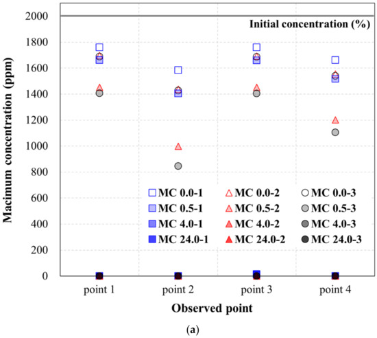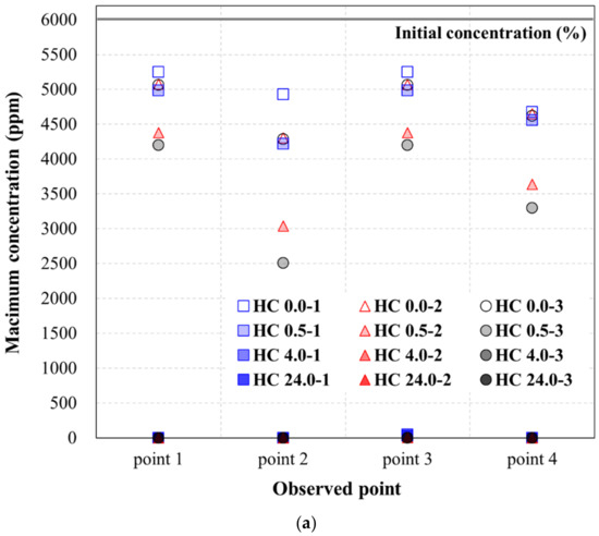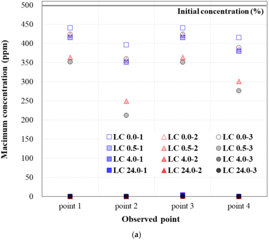 Figure 7a shows a graph of the maximum concentrations in Table 6. For the medium-TPH condition, the concentration decreased, compared to the initial concentration as the hybrid liner-TPH reaction time increased, regardless of the head-difference and observation point. Moreover, the hybrid liner-TPH reaction time greatly decreased at all observation points at and beyond 4 h. These results are identical to the high-TPH condition results.