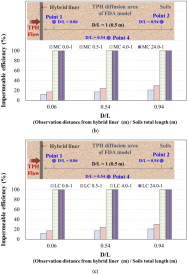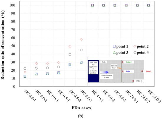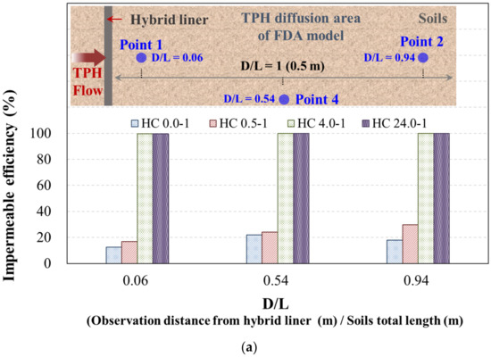 As described earlier, for each of the observation points, placed 0.03 m (point 1, point 3), 0.27 m (point 4), and 0.47 m (point 2), based on the total length of the soil (L = 0.5 m) behind the hybrid liner, the TPH concentration was observed, and the influence of the distance of the observation point was analyzed. If the observation points for the TPH concentration are expressed as distance ratios (D/L), point 1 (same as point 3), point 2, and point 4 are identified as 0.06, 0.94, and 0.54, respectively. Accordingly, the impermeable efficiency with respect to the distance ratio was analyzed using the concentration reduction ratio. For the impermeable efficiency, we considered an extreme situation limiting the FDA results by applying the head-difference condition with the lowest concentration reduction ratio. Figure 9 shows the results.