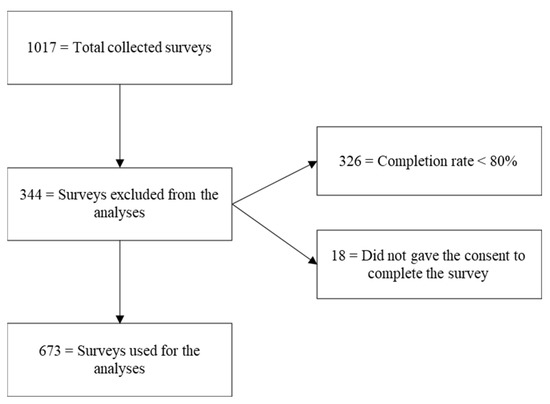 A total of 1017 surveys were collected. Of these, 673 (62.2%) were deemed suitable for the analyses. Of the remaining 344 (37.8%), 326 (94.8%) were excluded because participants completed less than 80% of the survey, and 18 (5.2%) because they declined the consent to participate (see Figure 1). More than 1/3 of those who completed less than 80% of the survey (n = 140) just electronically signed the informed consent without answering any other question, while 2/3 of them (n = 225) answered fewer than the first 6 questions (i.e., gender, age, marital status, health status). For these reasons, the incomplete questionnaires could not be included in the analyses.