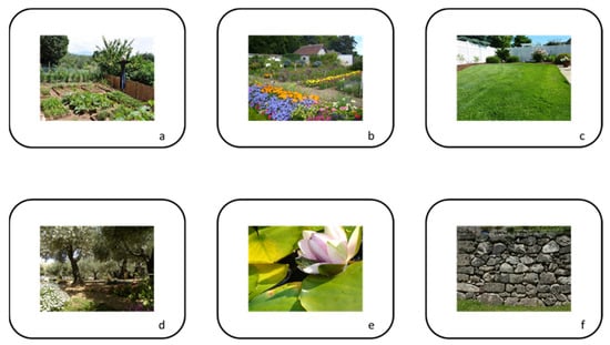 Home garden most usual “spaces”: (a) the vegetable garden; (b) the flower garden; (c) the lawn; (d) trees, shrubs, and hedges; (e) the garden pond; (f) paved and constructed surfaces.
