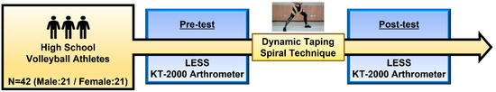 All athletes completed a baseline questionnaire that addressed sport-related injury history and demographic data, such as body height and weight. The entire examination was performed before the regular training program. Participants completed LESS and knee laxity examinations with a KT2000 arthrometer and then received dynamic taping. After taping, measurements of LESS and knee laxity were repeated immediately (Figure 1). All procedures, including jump tasks and dynamic taping, were performed in the high school health center.